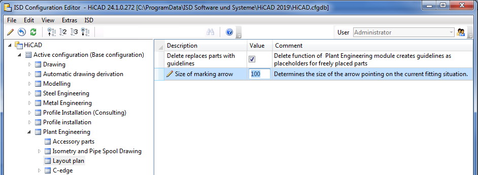 Also, the size of that arrow can be specified in the Configuration Editor at Plant Engineering > Layout plan. The value must be between 10 and 300 pixels, the default value is 80.