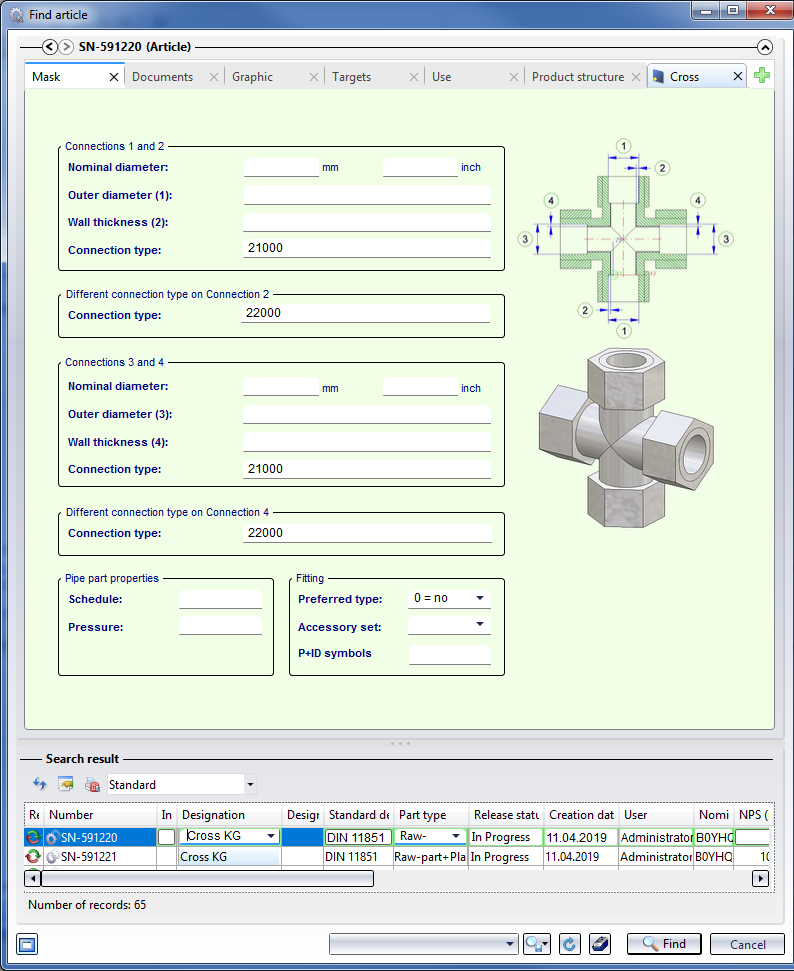 The new parts acc. to DIN 11851 for food ducts used in the food industry include crosses and valves the connection types for Connections 3 and 4 differ from each other. From HiCAD 2019 SP1 onwards, the HELiOS search masks will therefore contain corresponding new input fields, so that separate input fields now exist for deviating connection types for the Connections 2 and 4.