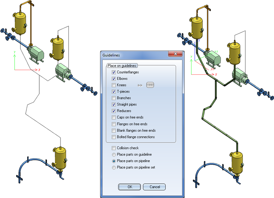 This option automatically places caps on vacant guideline ends (i.e. the start or end of a guideline). A guideline end is vacant if no part is located on the end point, and the end point is not located on the connection of a part that does not belong to the active pipeline.