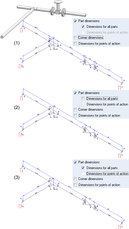 If you want to dimension the arcs of bent pipes to facilitate processing on bending machines, activate/deactivate the desired checkboxes in the Draw angular dimensions area at the bottom left.