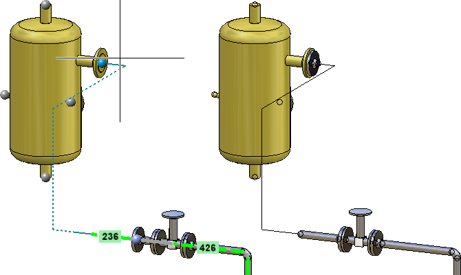 If connecting guidelines are created it makes sense to move parts like seals or flanges to the end of the newly created guideline. This behaviour can be switched on in the dialogue window , by activating the Create connecting guidelines and the Move connecting parts checkboxes.