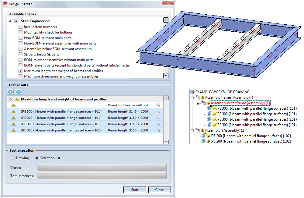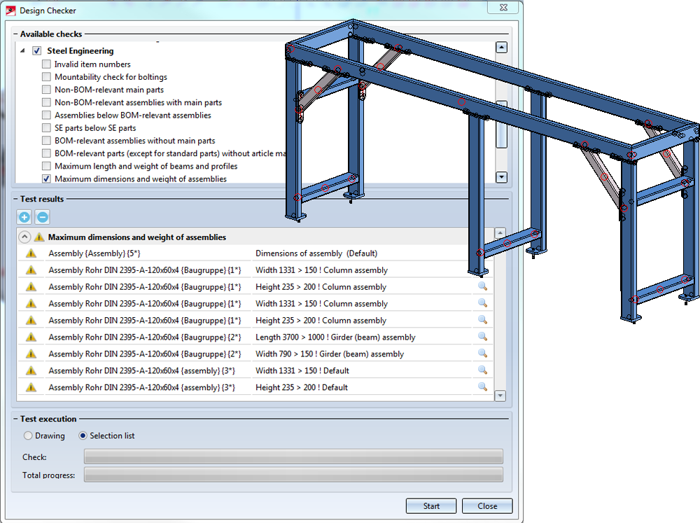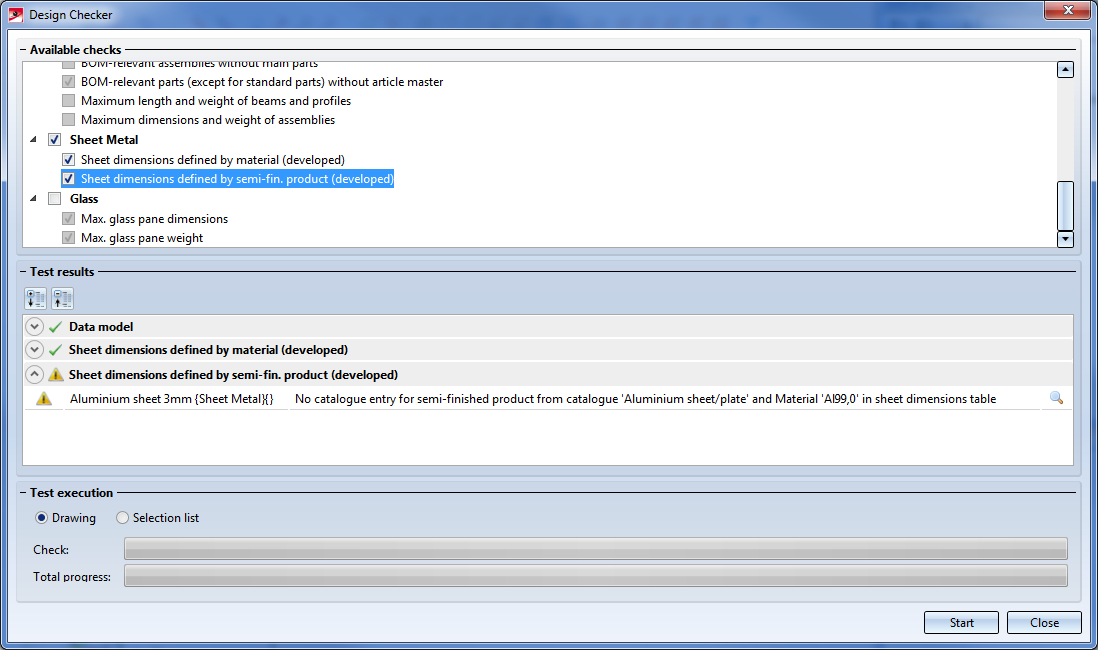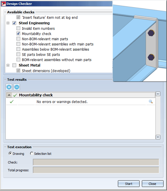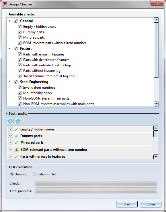 HiCAD checks the active drawing or all assemblies of the selection list. Activate the desired option in the Test execution area. As long as the dialogue window is open, you can freely change the selection list to be checked.