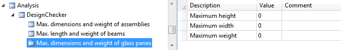 it is checked whether the dimensions and weights of glass panes exceed the maximum values specified in the Configuration Editor, at Analysis > DesignChecker > Max. dimensions and weight of glass panes