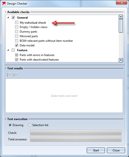 A number of tests that cannot be modified has been predefined by the ISD. However, administrators or users with programming skills can define their Individual checks and use them in the Design Checker.