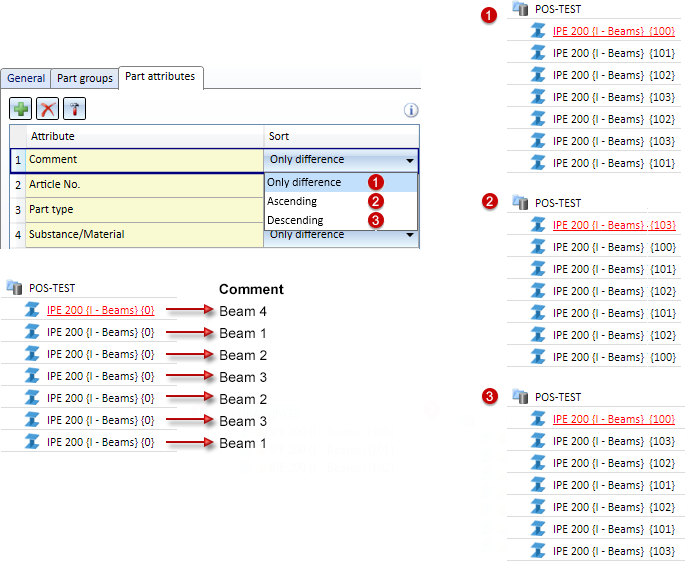 On the right hand side you can see the effects of the sort criteria on the assigning of item numbers on the basis of Comment. For the attributes article number, part type and substance/material, Only difference was chosen.