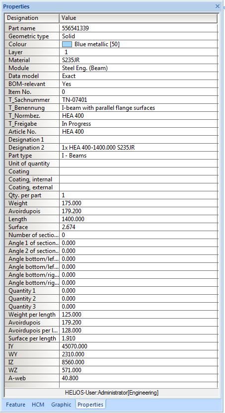 Display single-column part structure, HiCAD Properties