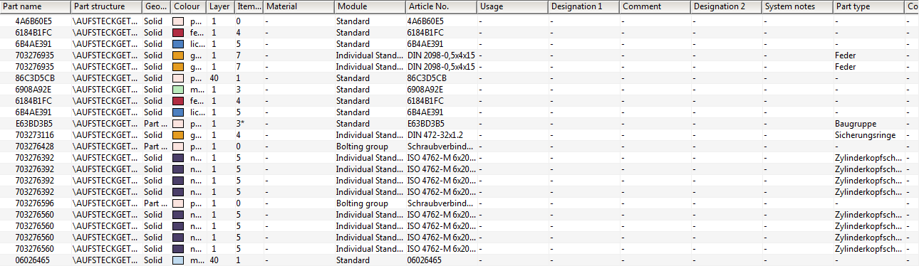 Content of column Designation, part name replaced by HiCAD properties