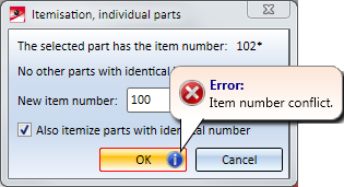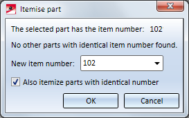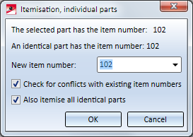 Also itemise all identical parts checkbox. If the active part already has an item number, this number will be shown and can be changed. Also, HiCAD will show you whether identical parts with this number exist.