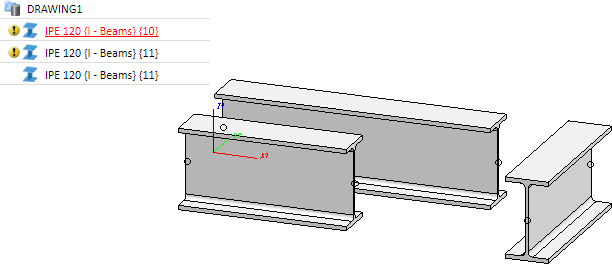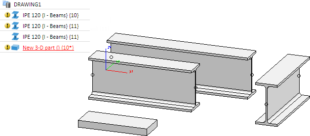 Now, one of the beams is lengthened. The item number of this part is therefore marked with an asterisk *. Then, a 3-D part is inserted in the drawing. An item number is assigned manually with the Part attributes