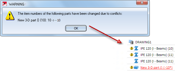 If you now perform the automatic itemisation for new and changed parts, HiCAD will detect that the item number 10 that was manually assigned to the 3-D part will lead to a conflict, because one of the beams already has item number 10. In this case the manually assigned item number will be corrected automatically, and an appropriate message will be issued.