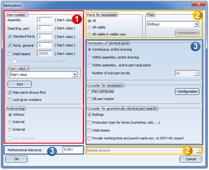 If the checkbox is deactivated, all parts will always be re-itemized If the checkbox has been activated, the item numbers of already edited parts will be (internally) set to a negative value, and will be marked either with an asterisk * or by a colour representation (depending on the settings in the ICN), i.e. in {5*} or 5. If your drawing contains any parts or assembly marked in this way, you can specify in the listbox at the bottom of the dialogue whether all parts, or only new and changed parts are to be (re)itemised. This means that you can perform a targeted itemisation for changed parts (marked with an asterisk *) This is of particular importance for the manual assigning of item numbers.