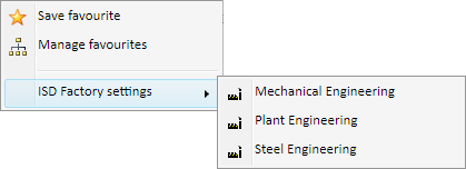 Favourites are saved to the same-named sub-folder of the directory in which the HiCAD Configuration database is also located. If you have installed HiCAD from the red DVD with the ISD default settings, this will be the folder ProgramData\ISD Software und Systeme\HiCAD nnnn, with nnnn being the HiCAD version, e.g. 2017. For each functional area you have saved as a favourite a corresponding sub-folder will be created in the FAVOURITES folder, e.g. SteelEngineering\STAIRCASEconfigurator for the Staircase Configurator in Steel Engineering.