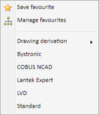 For various functions, the settings specified in the dialogue window can be saved as favourites and re-used at any time if desired. Several functions for the management of Favourites are available that allow you to rename, delete, import, export or arrange these Favourites.