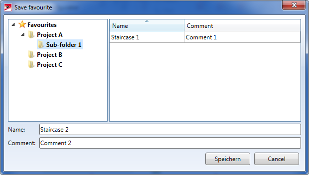 Save favourites Enter the Name under which the current settings are to be saved. In addition, you can enter a Comment (here: to Sub-folder 1).