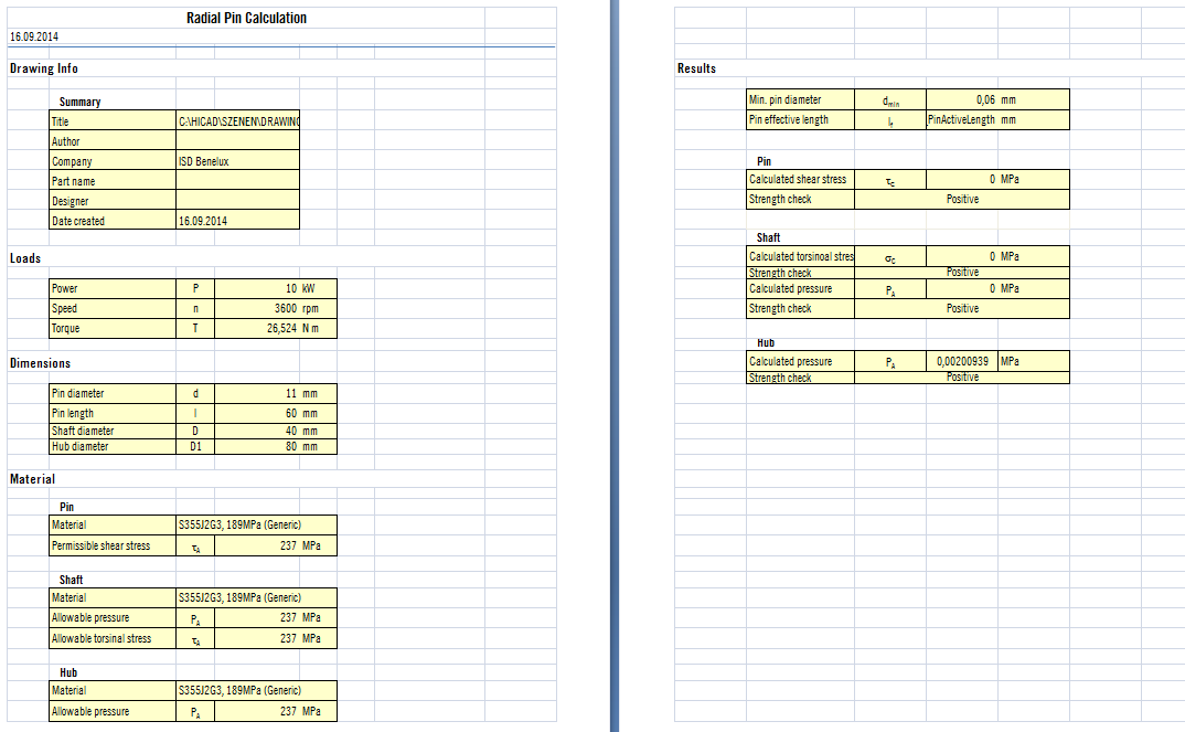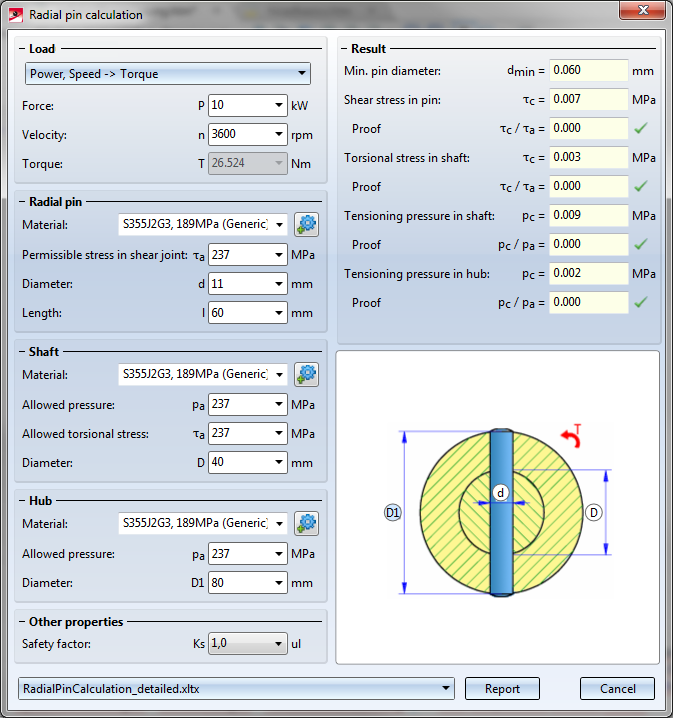 Use this function to check whether a radial pin that was inserted for the connection of a shaft and a hub has the required stability. The function calculates the minimum diameter of the pin, the shear stress in the pin, the torsional stress and the tensioning pressure in the shaft, and the tensioning pressure in the hub.