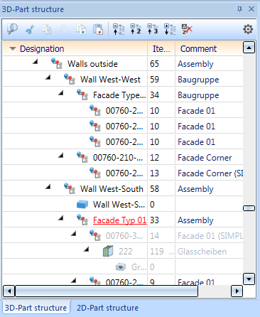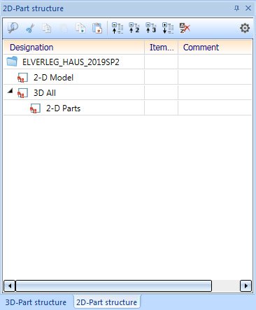 This displays the part structure of the active drawing, separately for 2-D and 3-D parts, providing you with information on the main parts that exist in the drawing, the assigned sub-parts, the part types etc.