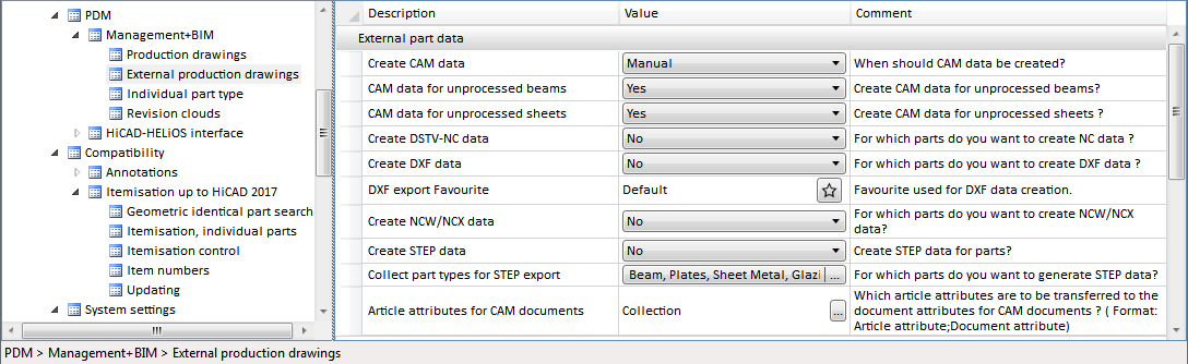 Which CAM data will be created and which article attributes will be assigned to the CAM document attributes also depends on the settings at PDM > Management + BIM > External production drawings. Only those CAM data will be created that you explicitly selected in the settings. For instance, if all settings for the Create ... data parameters have been set to No, no CAM data will be created. This applies both to the automatic and to the manual creation, i.e. even the Production function will then generate no CAM data.