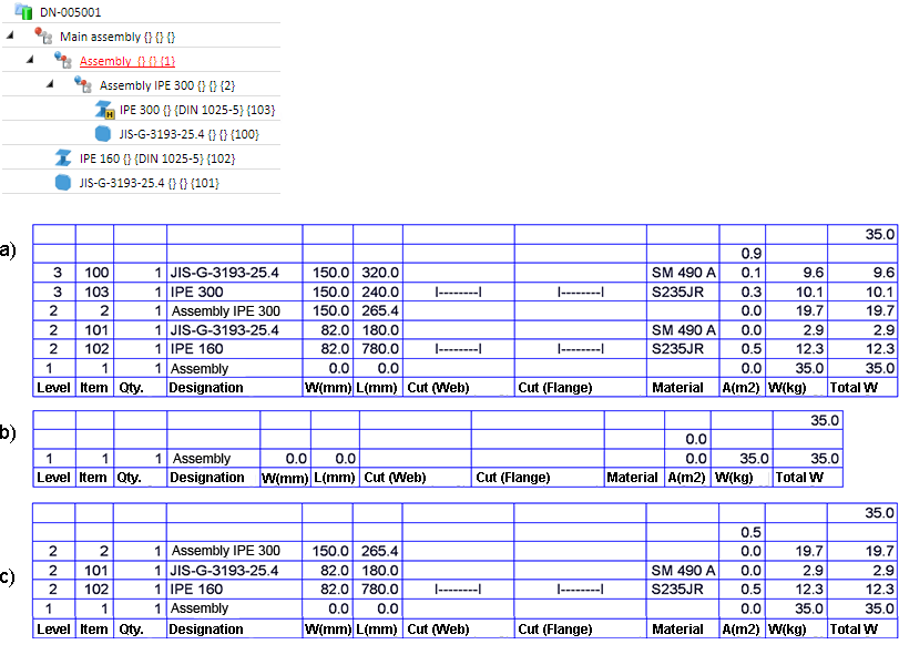 Example: The image below shows the part structure of a model drawing and structure BOMs of the model drawing: a) None of the assemblies is pre-mounted. b) Assembly 1 is pre-mounted, Assembly 2 is not. c) Assembly 2 is pre-mounted, Assembly 1 is not.