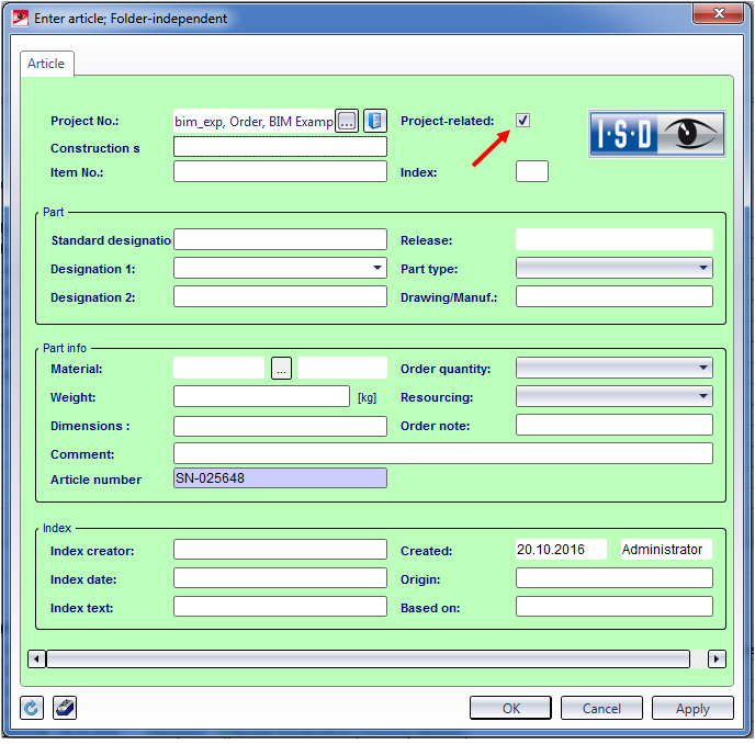 Subsequently set Steel Engineering Drawing Management identifier When editing large projects with the Steel Engineering Drawing Management module, referenced assemblies and drawings linked to them are frequently used. In such cases, identical part search, itemisation and drawing derivation often takes place in the drawings fr the sub-assemblies. The goal is to achieve a Steel Engineering Drawing management-conform behaviour of the article masters of referenced assemblies, i.e. that in case of attribute or item number changes the HELiOS attributes will automatically be updated as well. In practice, however, the referencing of assemblies takes often already place in an early drafting stage, where the parts have not been itemised yet. This means that these parts have no automatically assigned Steel Engineering Drawing Management ID in the HELiOS article master and in the HiCAD part attributes You can use the STAHLBAUAUTO attribute to set this identifier subsequently. The dialogue masks that have been adjusted especially for civili engineering tasks already contain this attribute. In this way, manually referenced assemblies can be identified subsequently as automatically created Steel Engineering Drawing Management article masters by activating the checkbox in the article master data mask.