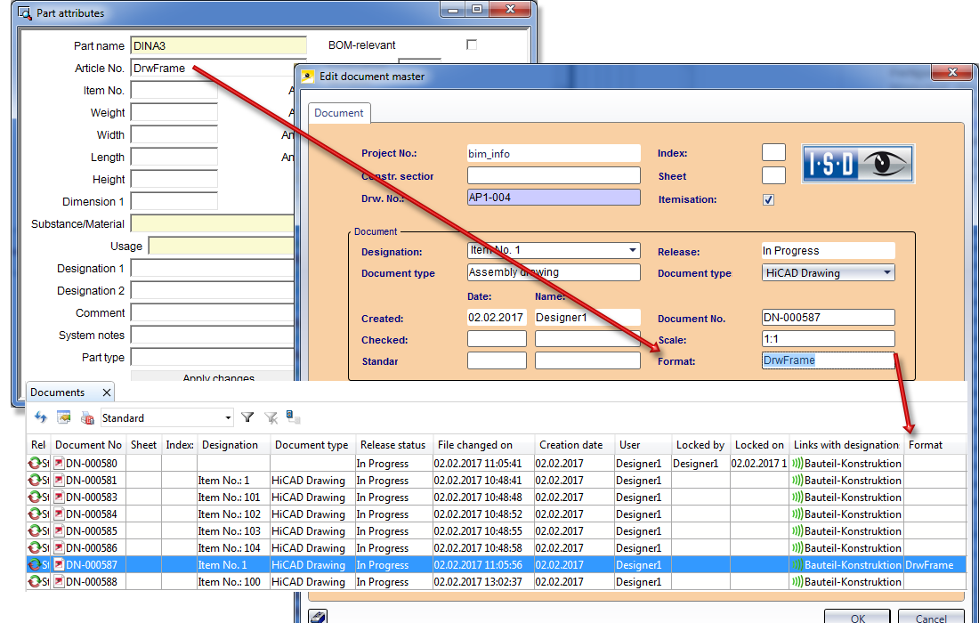 HiCAD attribute of drawing frame for production drawing During generation of production drawings the HiCAD attribute Article number ($BB) of the drawing frame will be transferred to the HELiOS document attribute FORMAT.