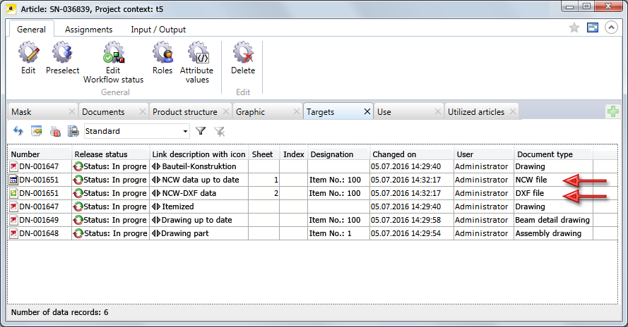 In contrast to the documents for the individual beams and plates, the PDF, DXF and DWG files for production drawings can be automatically created - either upon checkup, or upon release, or upon creating and updating of the drawing. |
