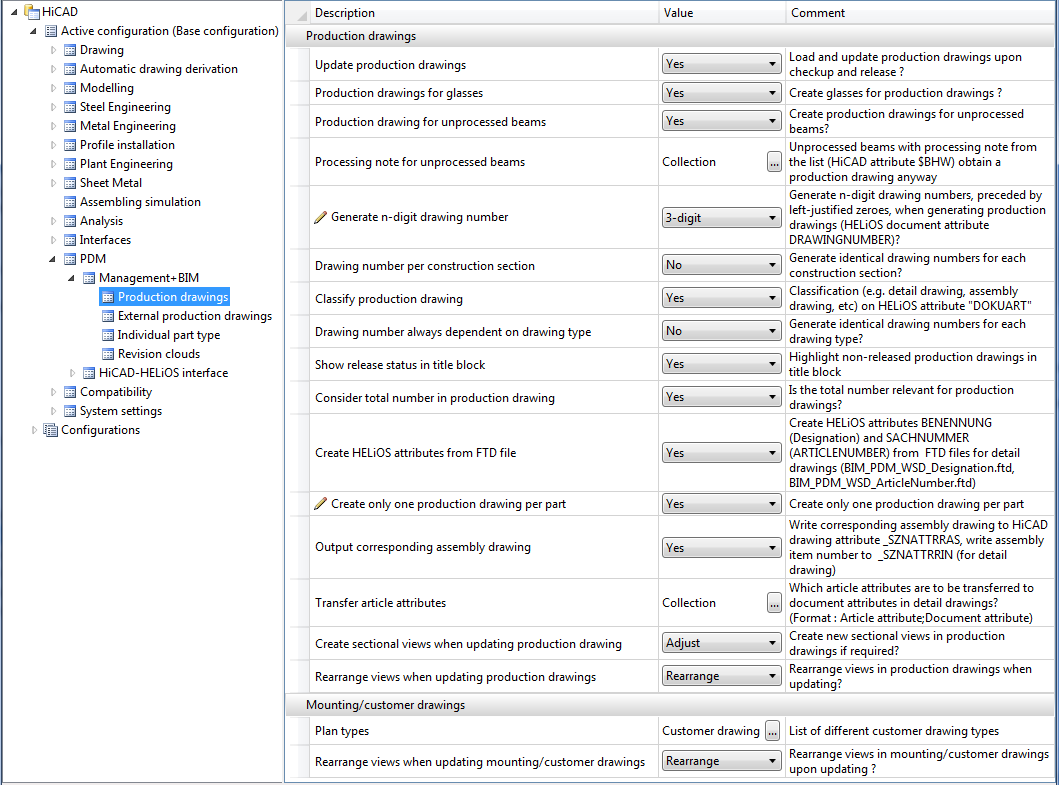 You can additionally influence the behaviour of the production drawing generation via the Configuration Editor (ISDConfigEditor.exe in the HiCAD EXE directory). The relevant settings can be found at PDM > Management + BIM > Production drawings.
