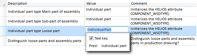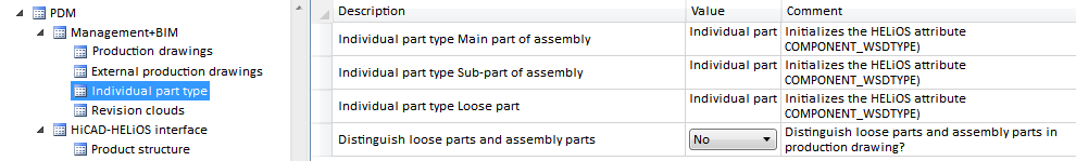 Here you specify which string is to be assigned to the HELiOS article attribute COMPONENT_WSDTYPE. The setting can be specified separately for main parts, sub-parts and loose parts. The default setting is the text stored in the HiCAD text key IndividualPart. This is the string "Individual part".