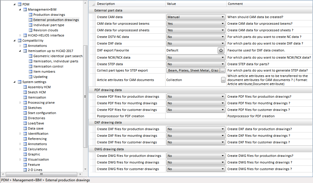 Here you specify whether DXF, DWG or PDF files of the production drawings are also to be auto-generated. Possible settings are as follows: