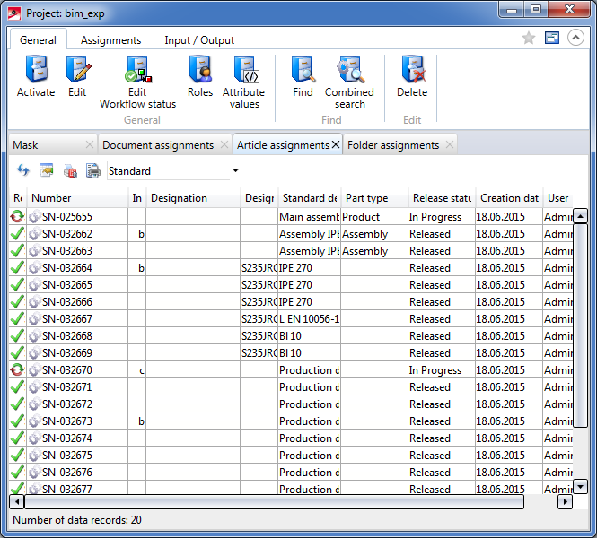 The Document assignment and Article assignment tabs provide information about the documents (model drawings, production drawings etc.) and parts (assemblies, beams, plates etc.) which are linked to the active project.
