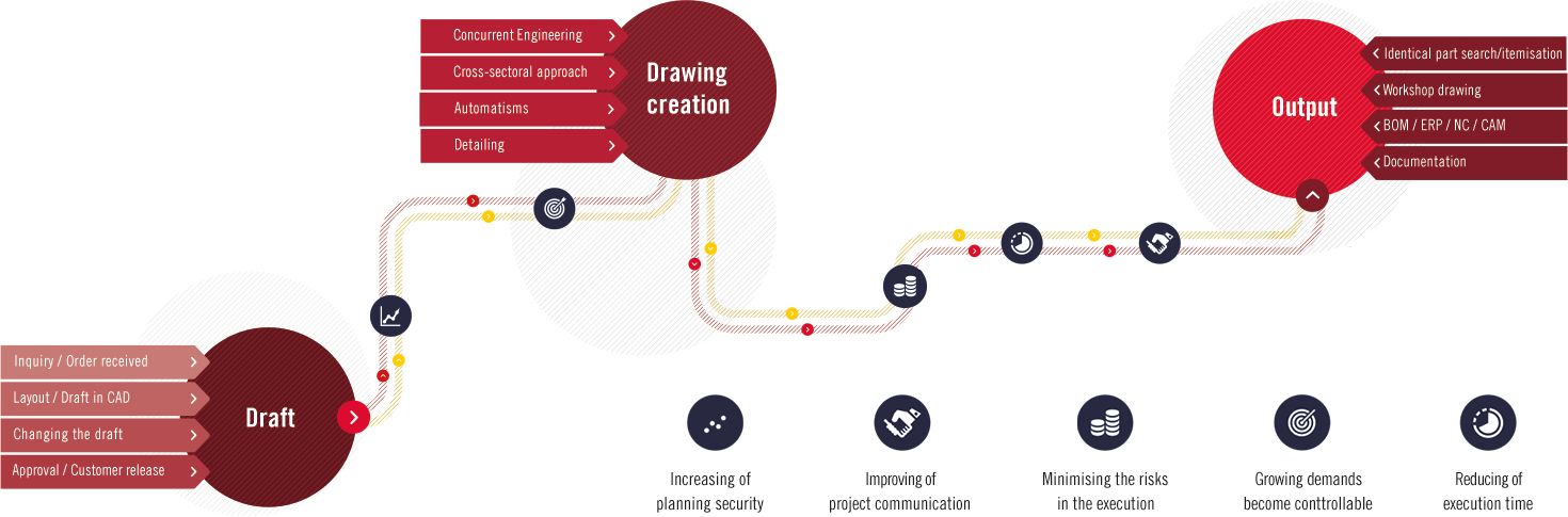 Management + BIM works in a project-oriented manner, helping CAD engineers to maintain an overview even during highly complex projects. Recurrent tasks can be performed at ease and at the push of a button. Examples of this include: