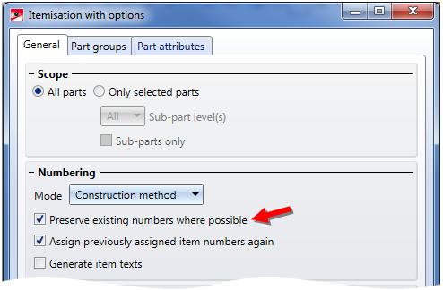 In the default settings for itemization beneath Numbering, the option Preserve existing numbers where possible will be activated. This means that only new and changed parts and assemblies will obtain an item number, while the numbers of existing parts and assemblies will remain unchanged if possible.