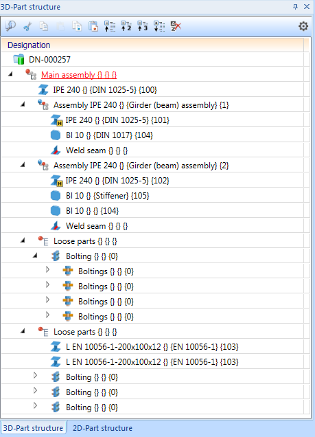 After confirming with OK, the parts and assemblies of the model drawing will be itemized immediately.