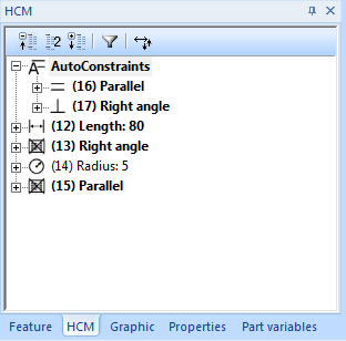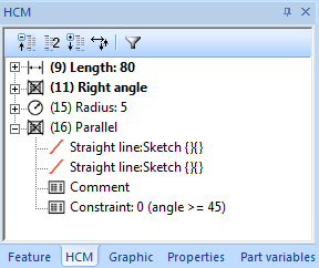 The editing of HCM constraints in sketches of a Feature step is now also possible if the editing of the sketch has been started by choosing Edit sketch for a Feature in the Feature log.