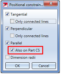 function for planar sketches and 3-D sketches now contains, beneath the Parallel option, the additional Also on Parts CS option.