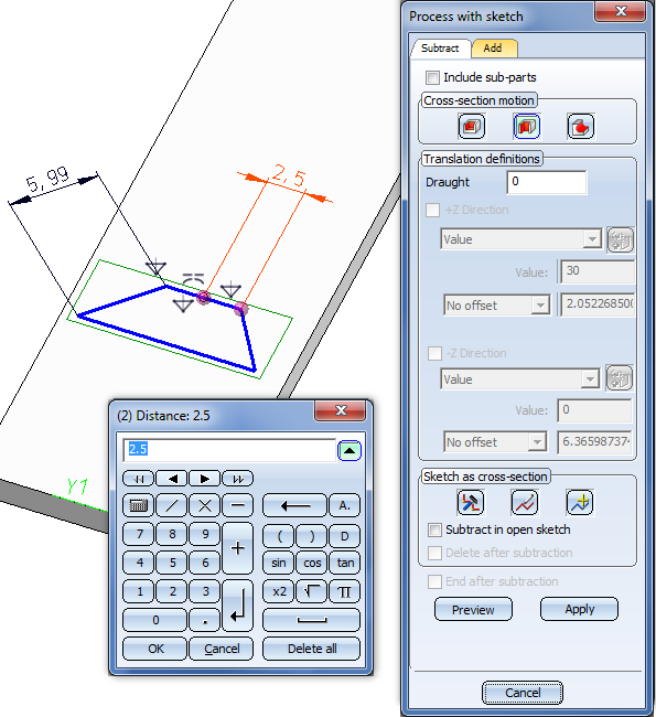 Youcan now change HCM constraints directly in the model drawing even while a dialogue window is open. This concerns, for example, the dialogues of the functions Extruded solid, Revolved solid, C-edge sweep, Subtract or Add.