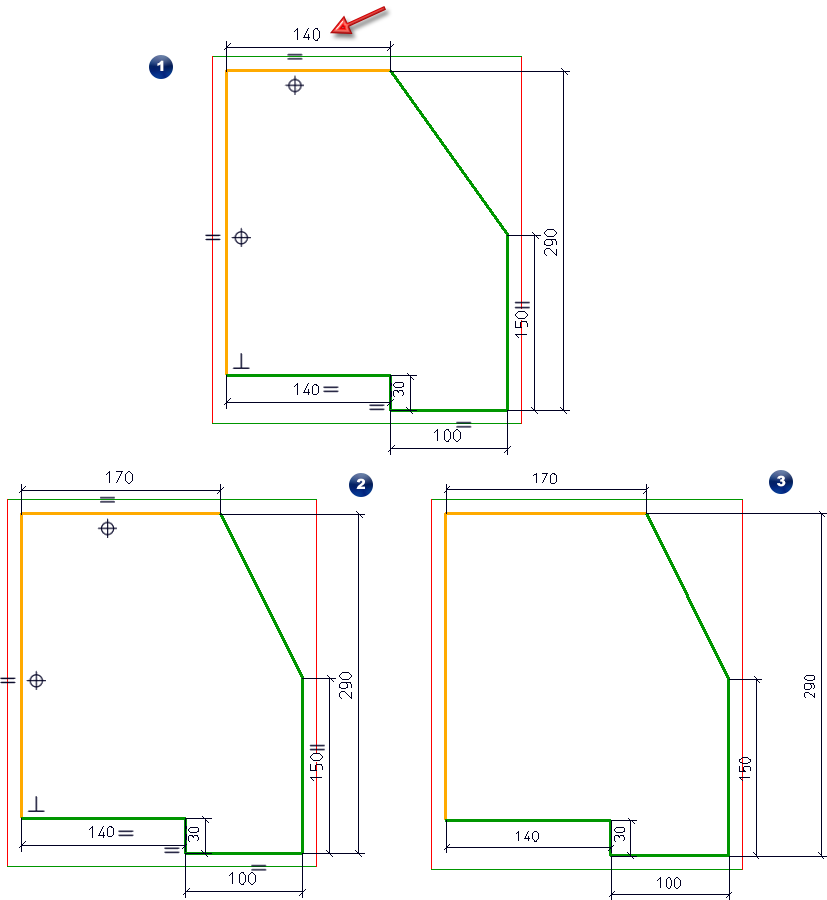 In the original sketch (1) the marked HCM dimension is changed from 140 to 170. (2) shows the result in HiCAD 2019 SP2, (3) shows the result in HiCAD 2018.
