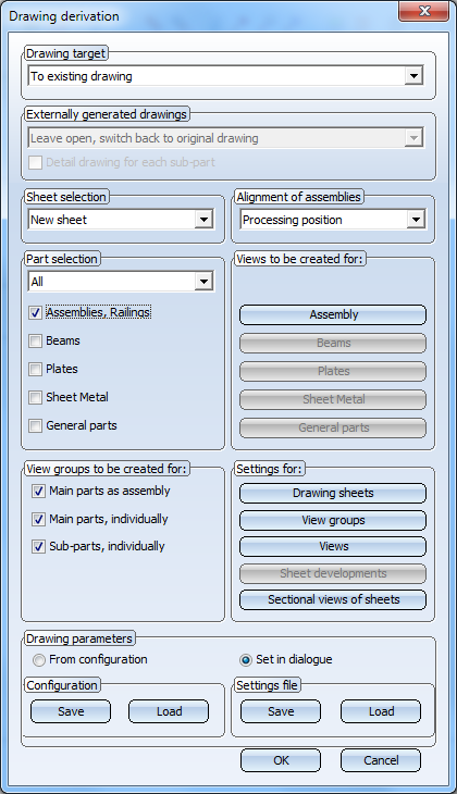 Then, choose Drawing > Itemisation/Detailing > Drawing derivation. In the Part selection field, activate only the Assemblies, Railings checkbox. Confirm with OK.