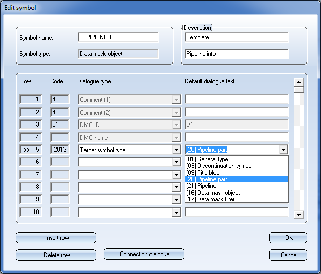 In the Target symbol type field you can specify a symbol type for which a data mask object filter is to take effect, i.e. for instance, only for pipe part symbols. The available symbol types can be selected from a combo box: