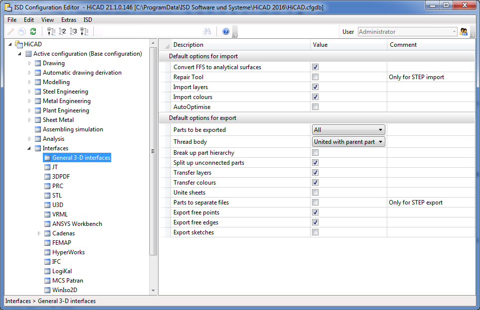 In the ISD Configuration Management under Interfaces, you can define which default settings are to apply to the import and export of the general 3-D interfaces such as Step, IGES, DXF/DWG, etc. These settings are then displayed as default in the respective import/export dialogue when called up in HiCAD.