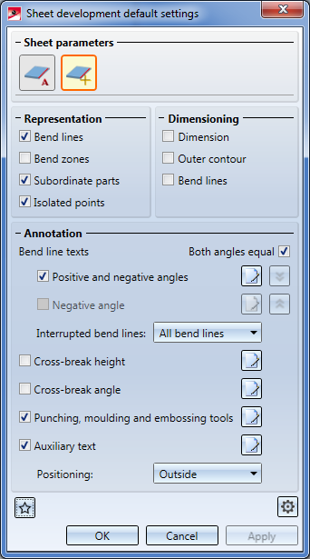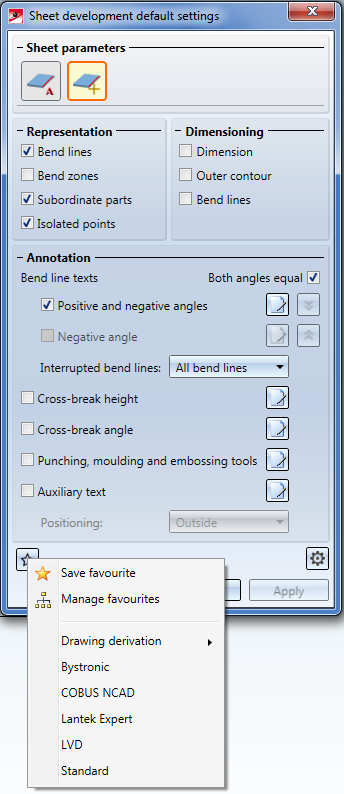You can also activate the machine-specific texts for drawing derivations. To do this, open the Drawing tab, choose Itemisation/Detailing > Derive... and, in the dialogue window, click the Sheet developments button. In the Sheet development parameters dialogue window you can then proceed as described above: Click the Favourites icon at the bottom left and choose either LVD or Bystronic.