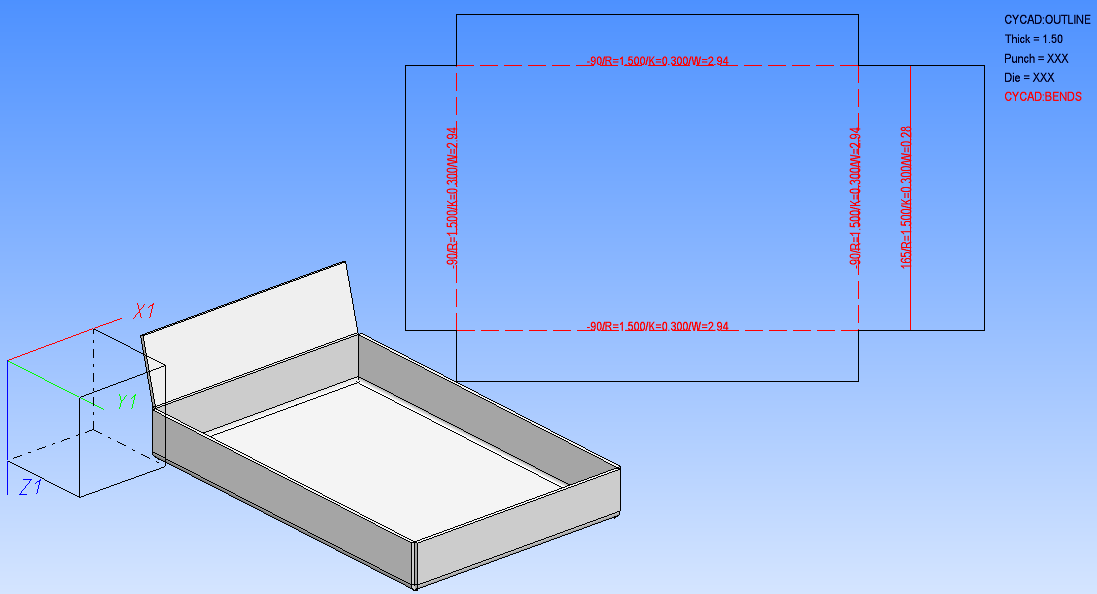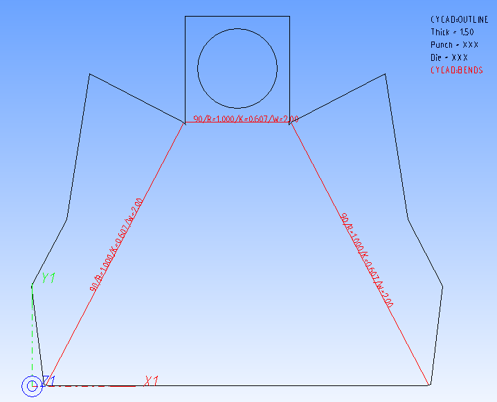 The information given for each bent edge (red) consists in the bend angle (in the above example 90 degrees for each edge), the radius (R=...), the allowance of the K-factor (K0...), and the lengthening (W=...). Continuous lines next to the information indicate upward bendings, dashed lines indicate downward bendings. These are the bending data of the CyCAD "BENDS" layer.