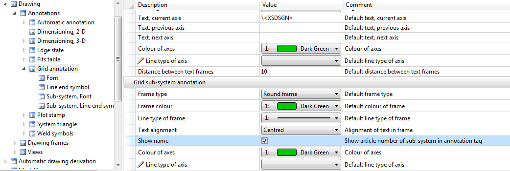 The automatic annotation settings for derived drawings can be specified in the Configuration Editor at Automatic drawing derivation > Production drawing > Grid annotation.