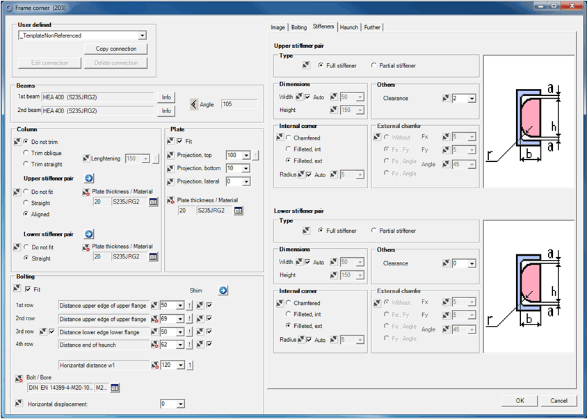 Click the Extended button to display further data of possible connections. If required, set one or several filters, such as Bolts, Strengths, etc. to restrict the selection criteria. Select the required connection and exit the window with OK.