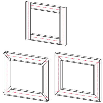 Top: Source beams, Bottom: Mitre-cut with clearance (left) and flush (right) |