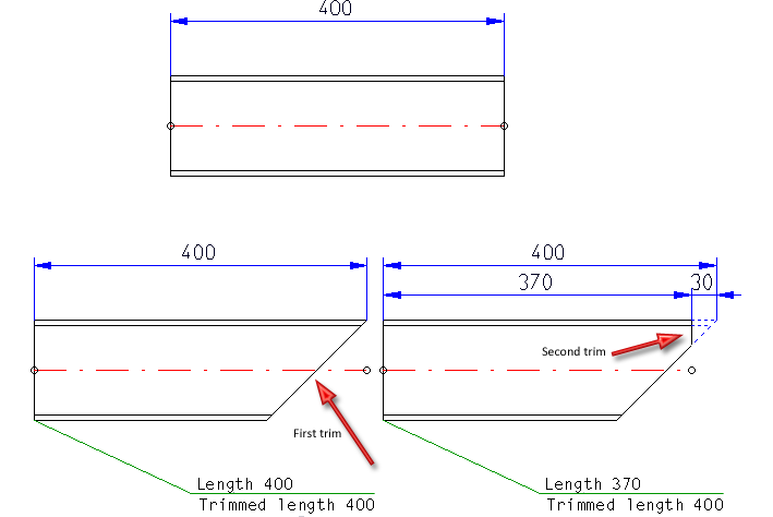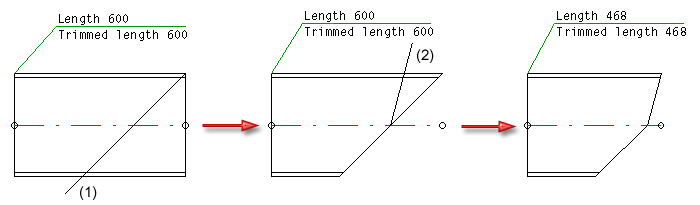 When beams are trimmed, the value assigned to the part attribute Length will be the total length of the trimmed beam. If two trimmings are applied to a beam, the calculated length will be the smaller of the two individual total lengths after applying the trimming. The beam length and the trimmed length will then be identical.