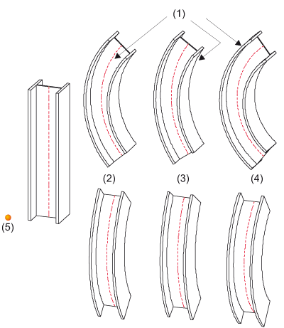 Curving by specifying the radius (1), (2) beam axis, (3) inner edge, (4) outer edge, (5) point for curvature direction