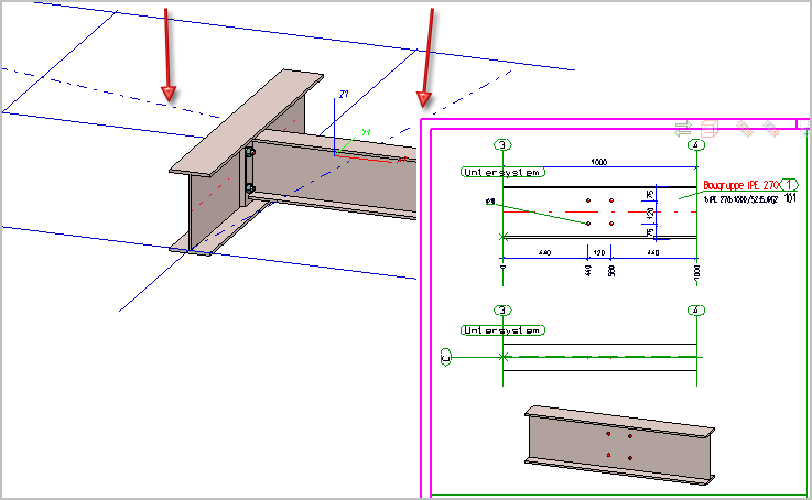 Left: Model drawing with grid and grid sub-system; Right: Detail of workshop drawing