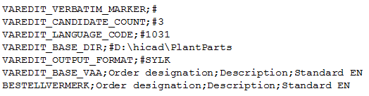 VAREDIT_VERBATIM_MARKER;# VAREDIT_CANDIDATE_COUNT;#3 VAREDIT_LANGUAGE_CODE;#1031 VAREDIT_BASE_DIR;#C:\HICAD\plantparts VAREDIT_OUTPUT_FORMAT;#SYLK VAREDIT_BASE_VAA;Order designation;Description; Standard EN BESTELLVERMERK;Order designation;Description; Standard EN |