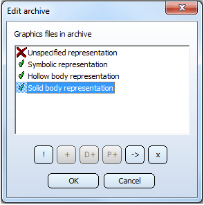 When you click the Edit repr. button, all representation types are listed. A red cross means that the representation type is not available. A green checkmark indicates that this representation type exists in the variant. The 6 buttons for the processing functions refer to the marked list row. In the dialogue below, one representation type is not yet available in the archive and is therefore marked with a red cross:
