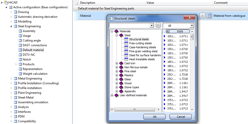 The entries for Material selection at Steel Engineering > Default material > Table ID for default material and Item ID for default material have been replaced by a more convenient catalogue selection option.